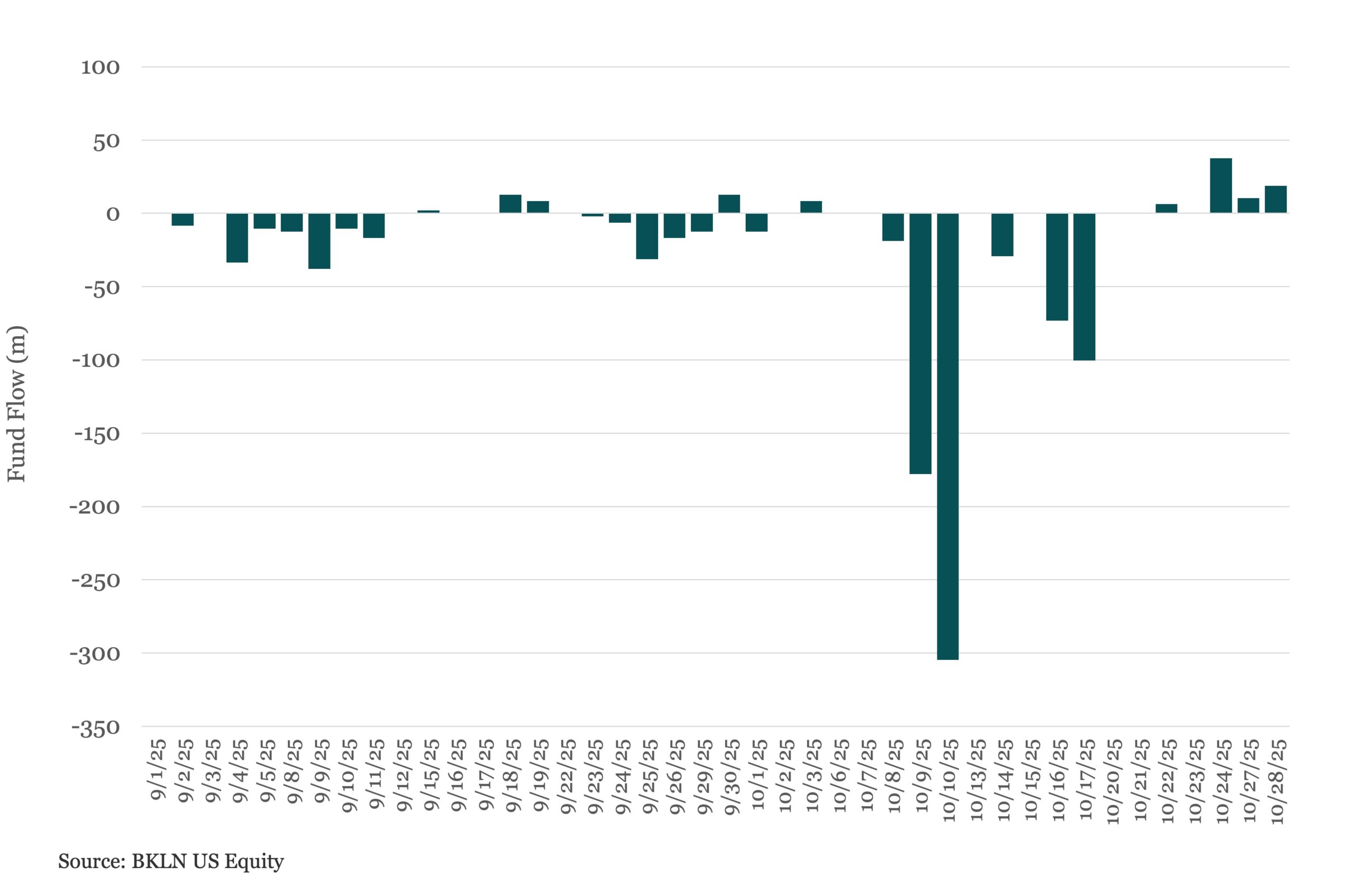 Retail investors have returned to loan funds following two consecutive weeks of net redemptions. The Invesco Senior Loan ETF (BKLN) recorded $73m in inflows during the week of October 21–28, a reversal from the $704m in outflows the fund experienced over the prior two weeks.