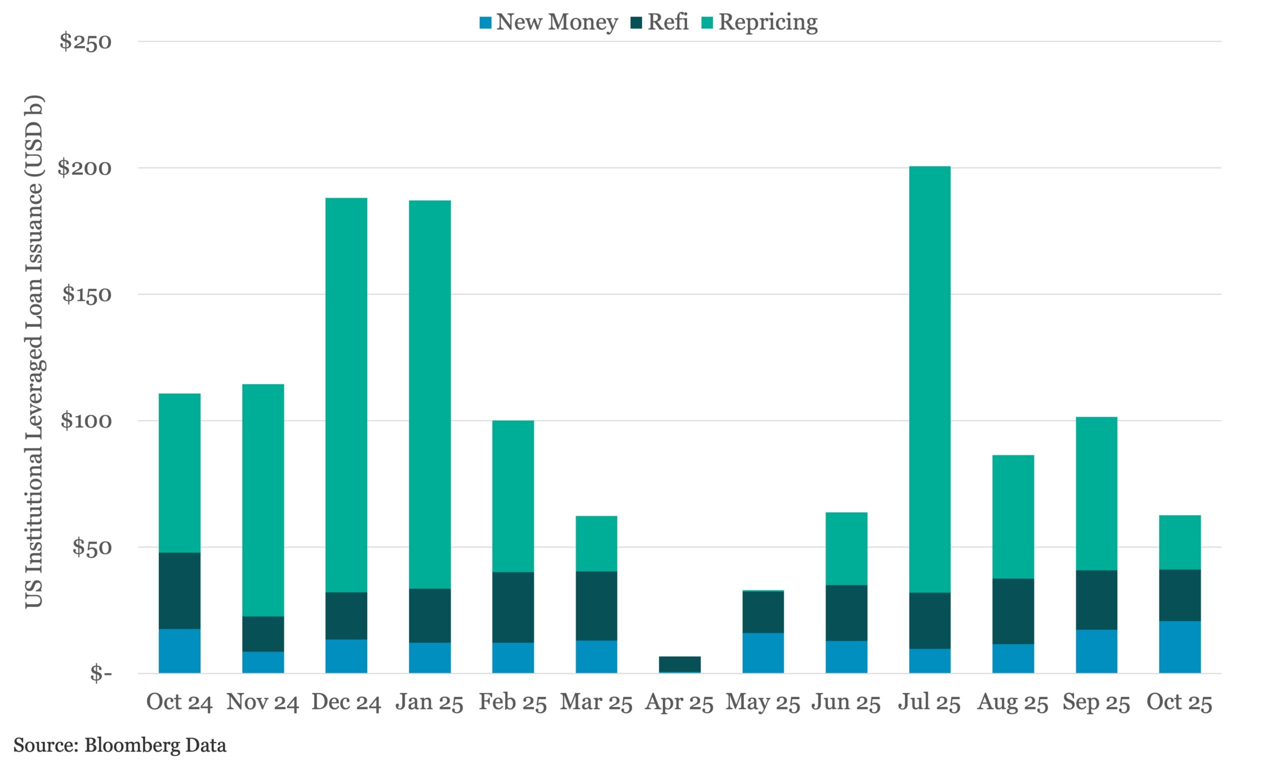 October saw a notable decline in US institutional leveraged loan activity, with 72 deals totaling $62.7b marking a 32.7% decrease from September’s $93.2b, and the slowest monthly volume since May ($31.6b). This brings year-to-date issuance to $881.9b across 791 deals, representing a 15% decline compared to the same period in 2024.
