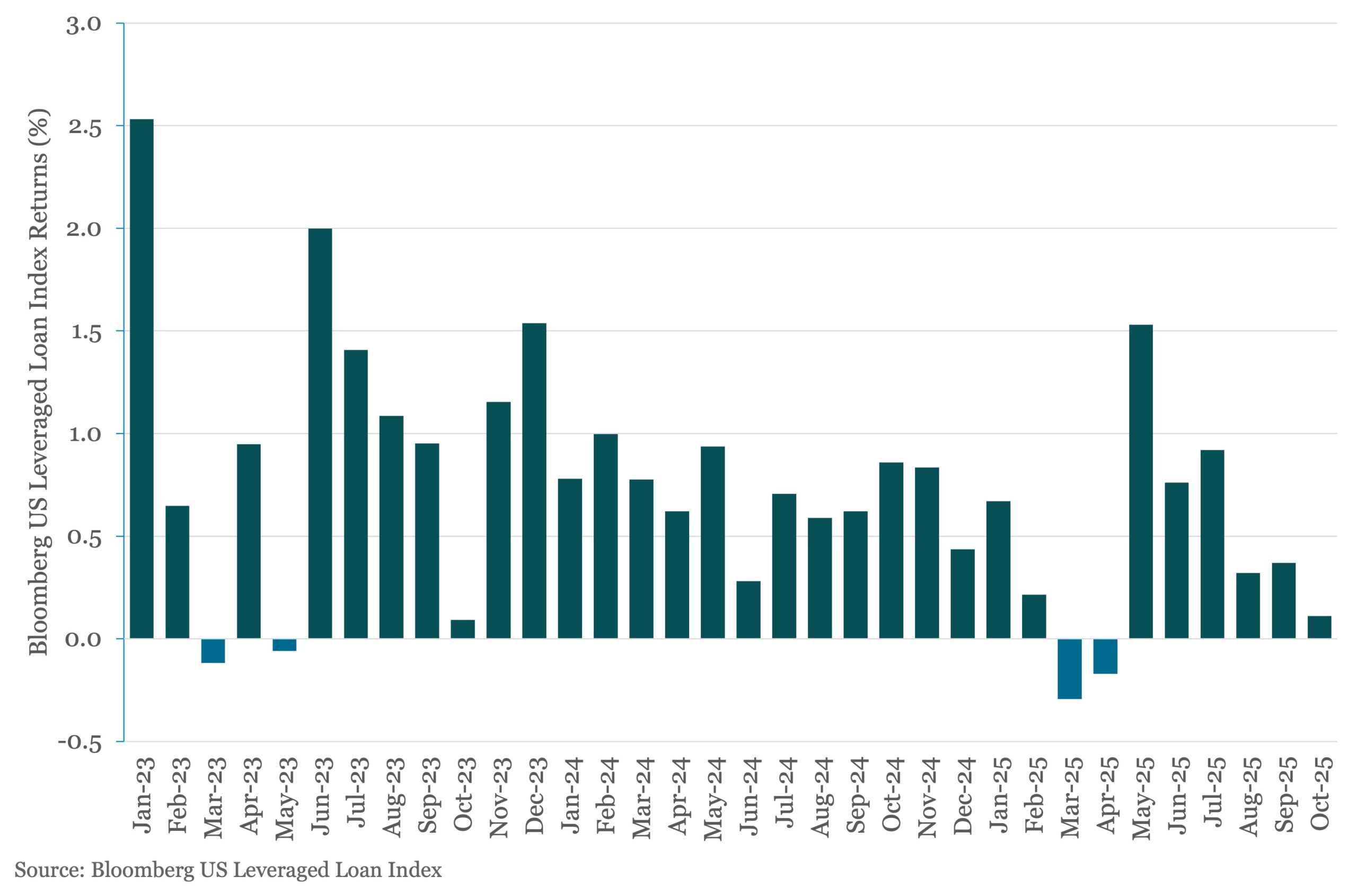 The Bloomberg US Leveraged Loan Index (Ticker: LOAN) returned 0.11% in October, bringing its year-to-date return to 4.50%. Average secondary market prices on US leveraged loans were 96.75 on October 31st, down from a monthly high of 97.08 on October 1st.