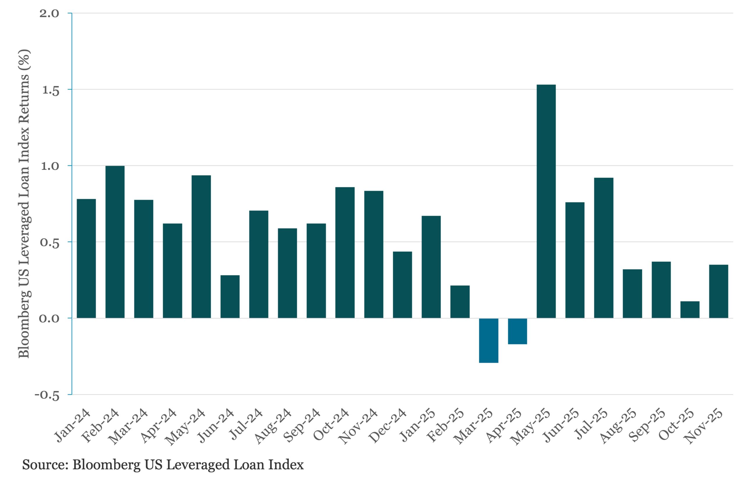 The Bloomberg US Leveraged Loan Index (Ticker: LOAN) returned 0.35% in November, bringing its year-to-date return to 4.86%. Average secondary market prices on US leveraged loans were 96.64 on November 28th after declining 11bps from the October 31st figure of 96.75.