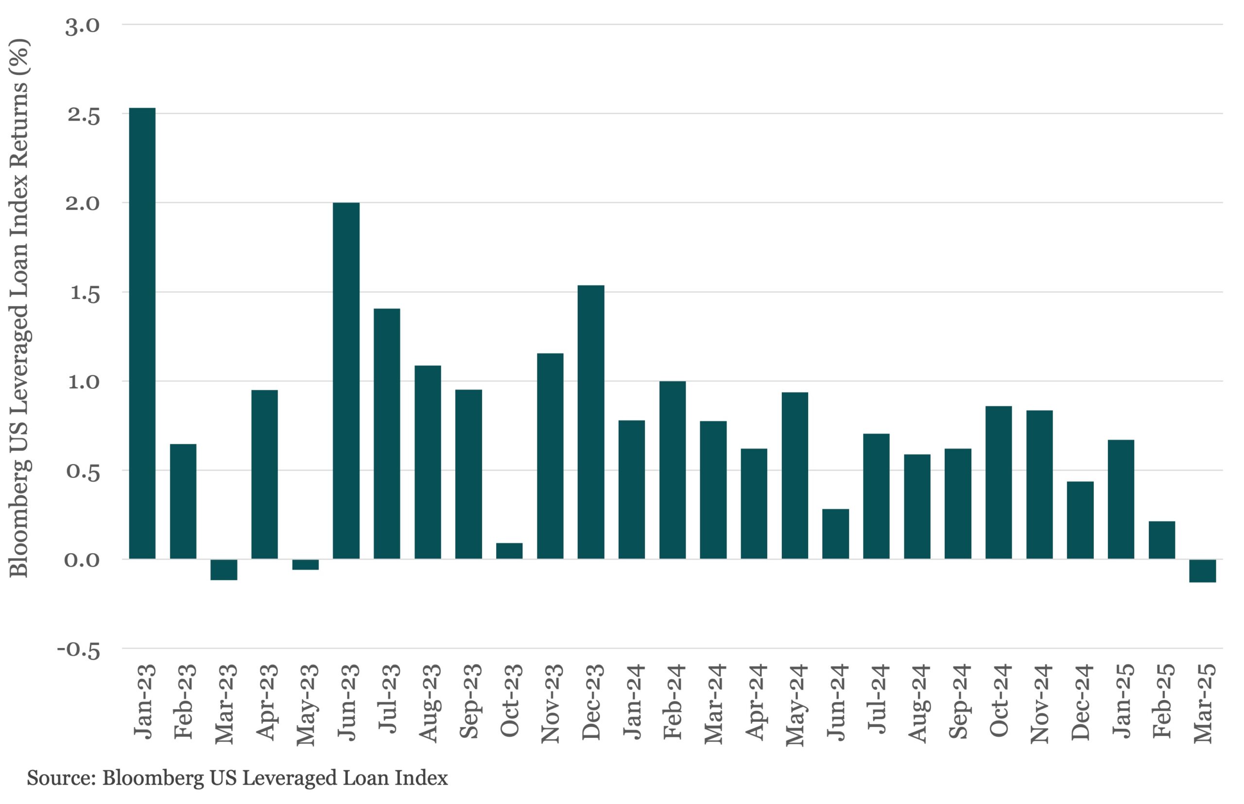 The Bloomberg US Leveraged Loan Index (Ticker: LOAN), a measure of the US institutional, broadly syndicated, leveraged loan market, returned just 0.21% in February, marking the weakest return since October 2023.