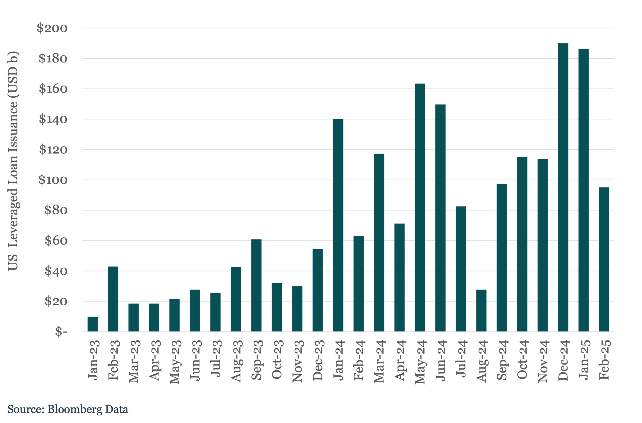 February’s $95b of US institutional leveraged loan issuance declined 49% from January’s $186.4b and represents the lowest volume since last August’s $27.7b. While it was a significant slowdown from last month, February issuance was up 51% from the same month a year ago, and year-to-date issuance is at its highest since Bloomberg began tracking the data in 2013, at $281.4b.