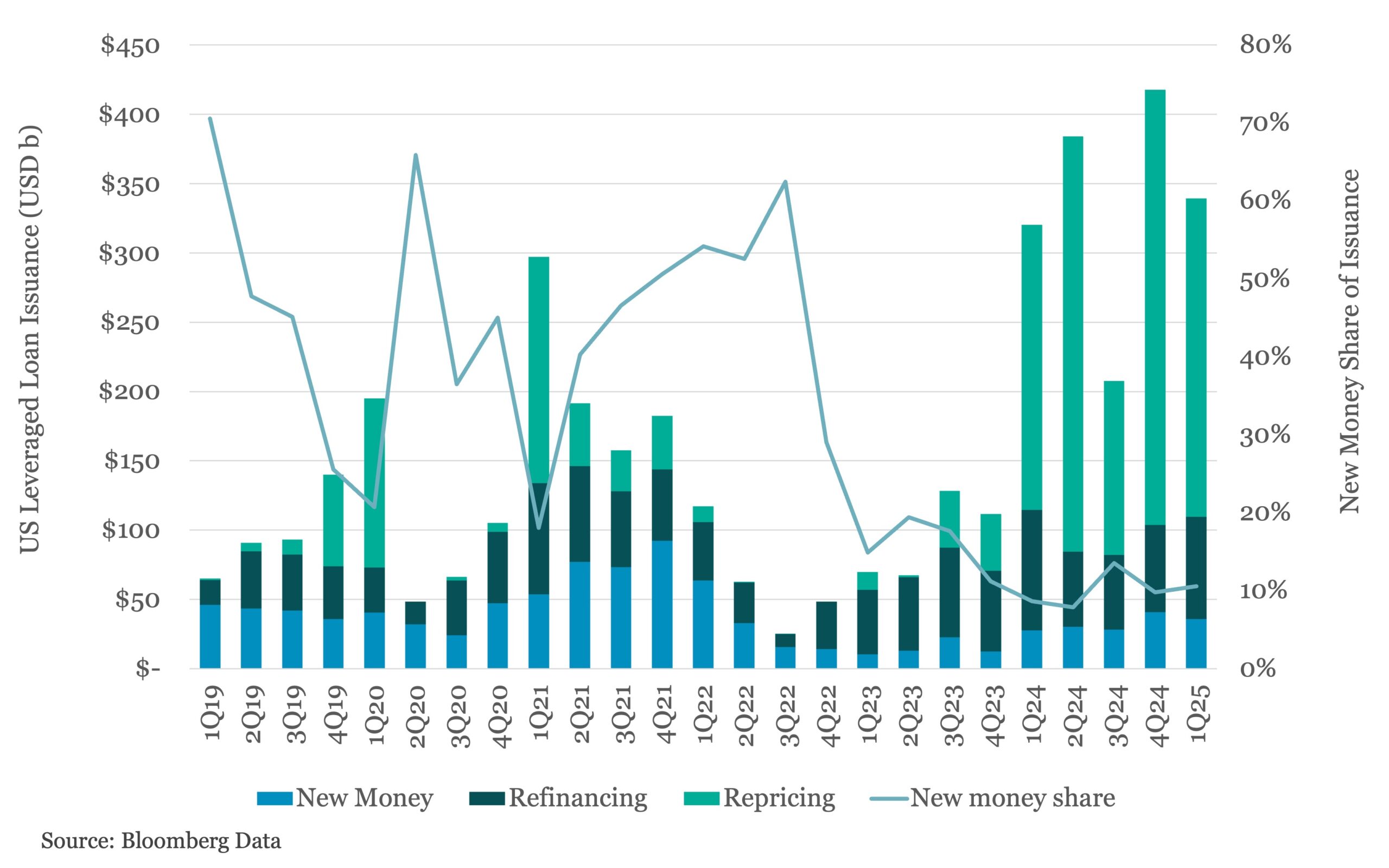 At just $35.9b or 11% of volume in Q1 2025, new money financing remains sluggish amid record levels of issuance. At $339.2b, first quarter issuance was among the busiest since Bloomberg began tracking the data in 2013, however that did not translate into the M&A spree many were hoping for.