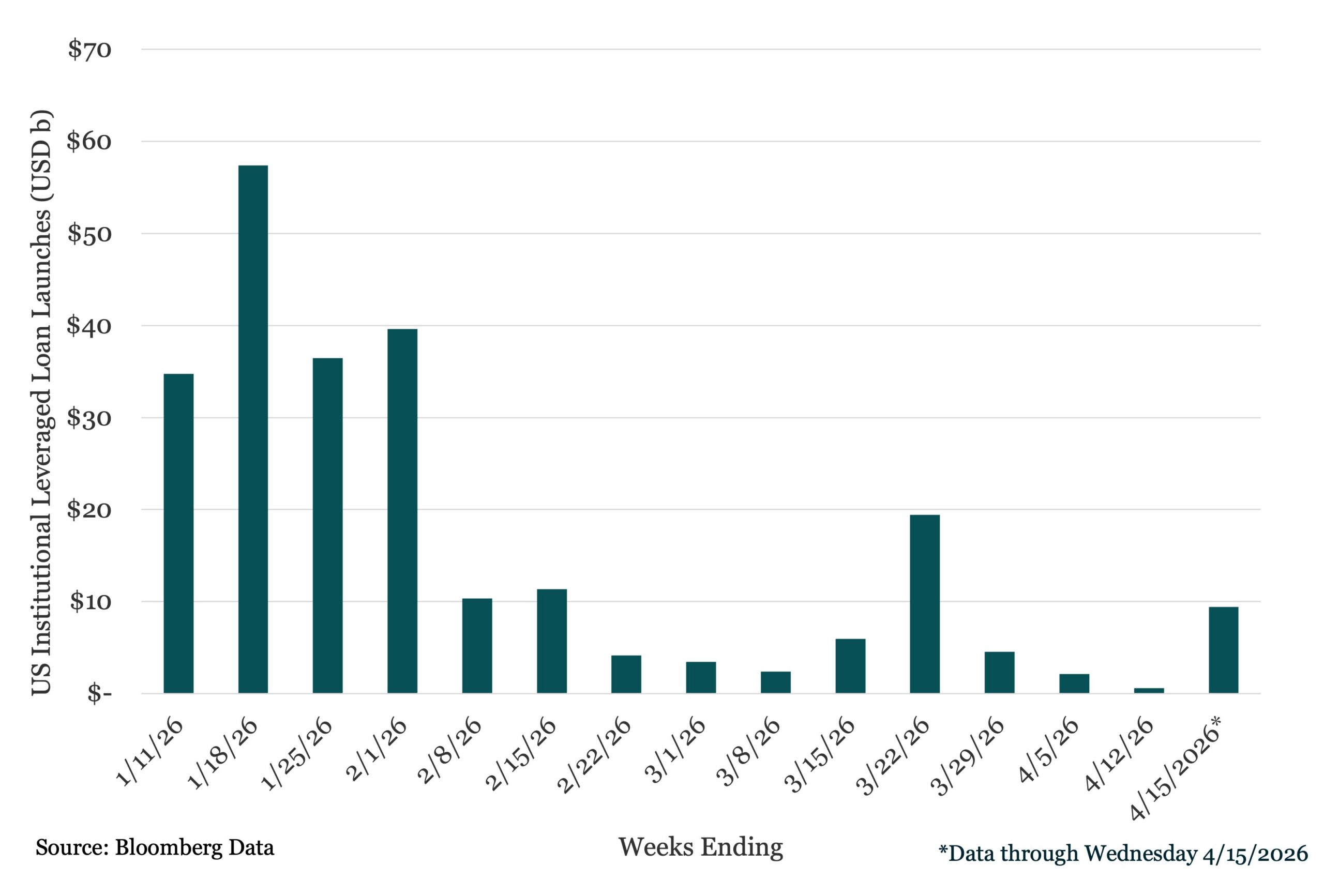 The US leveraged loan market has struggled to regain momentum following a sharp slowdown in issuance in February, as market volatility continues to weigh on activity. This week has shown signs of improvement, as $9.4b has been launched into syndication through April 15, more than the previous three weeks combined. It remains a far cry from January when weekly launches regularly topped $30b, however.