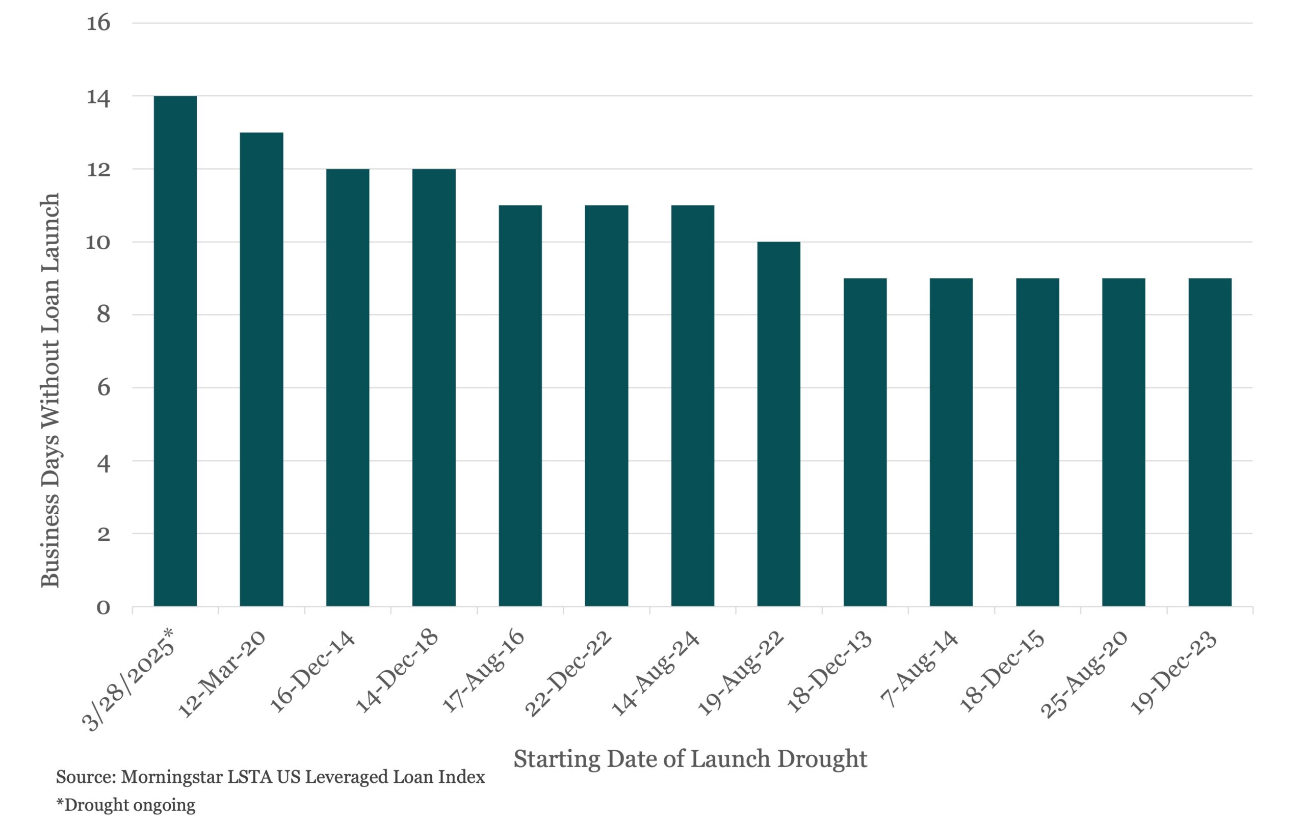 Wednesday, April 16th was the 14th business day running without a leveraged loan launch, marking the longest such primary issuance draught since Bloomberg began tracking the data in 2013.