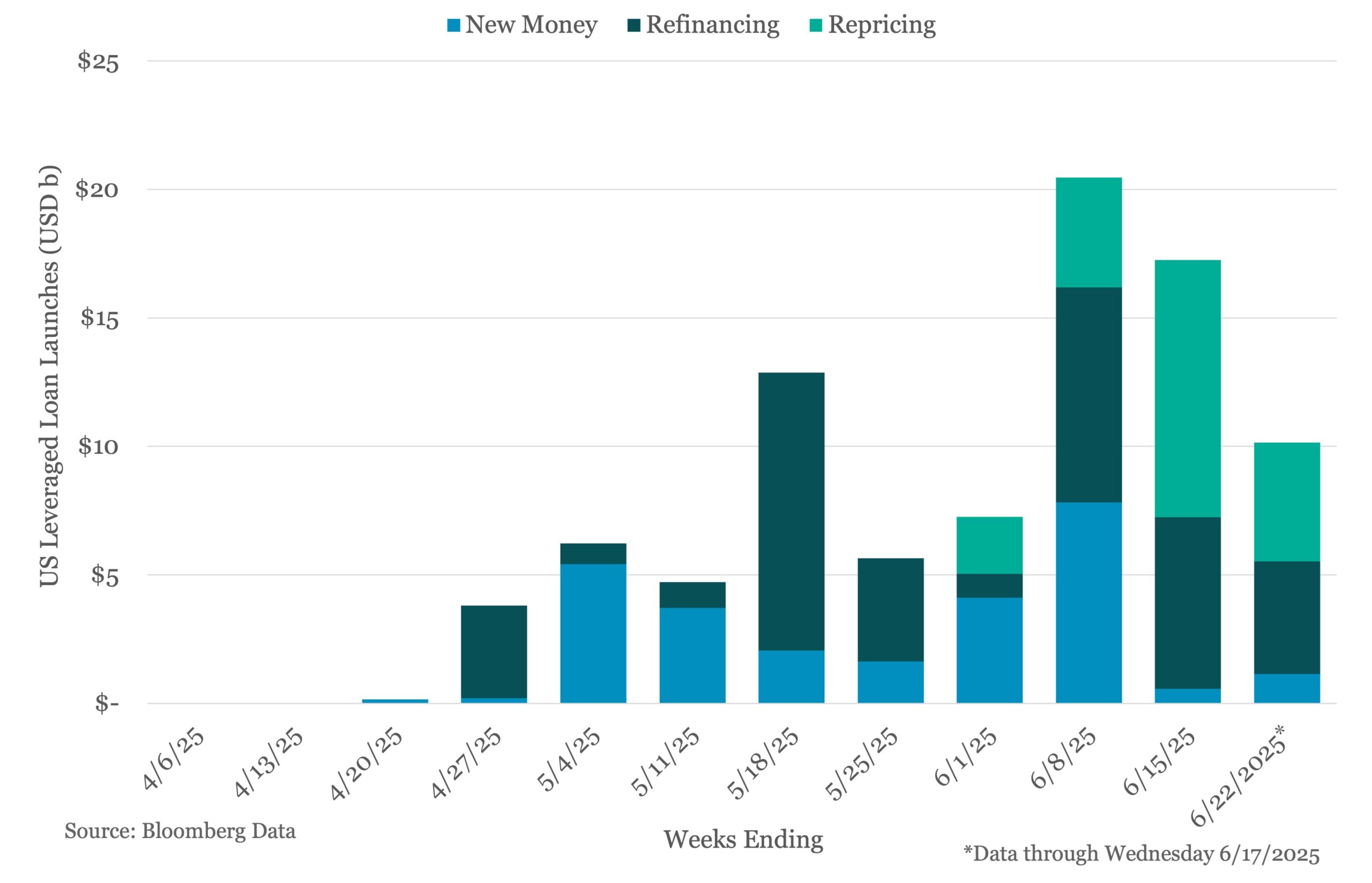 Through June 17th, 59 deals for $47.8b have launched into the US leveraged loan market this month for a 53% improvement from the full month of May figure. Weekly launches exceeded $20bn during the week ending June 8th for the first time since the week ending March 2nd.
