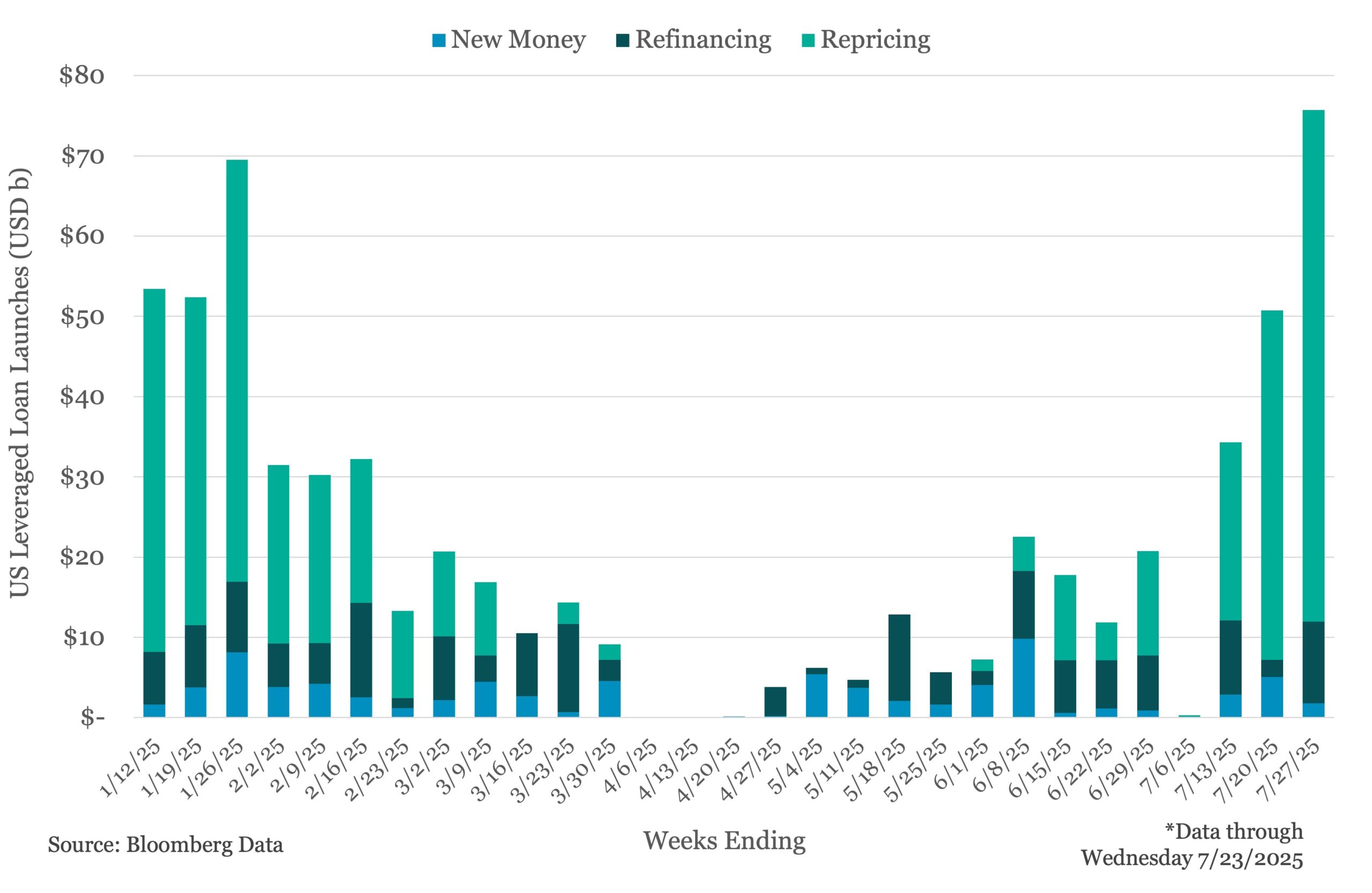 Following the most active single day of 2025 and the second busiest on record, the US leveraged loan market saw $61.7b in transactions launched to investors on Monday, July 21. By Wednesday, the weekly total had surpassed $75.7b, setting a new high for the year. With $160.8b launched month-to-date, July marks the most active month for syndications since January’s $206.7b and ranks as the seventh busiest month for primary market activity since Bloomberg began tracking the data in 2013.