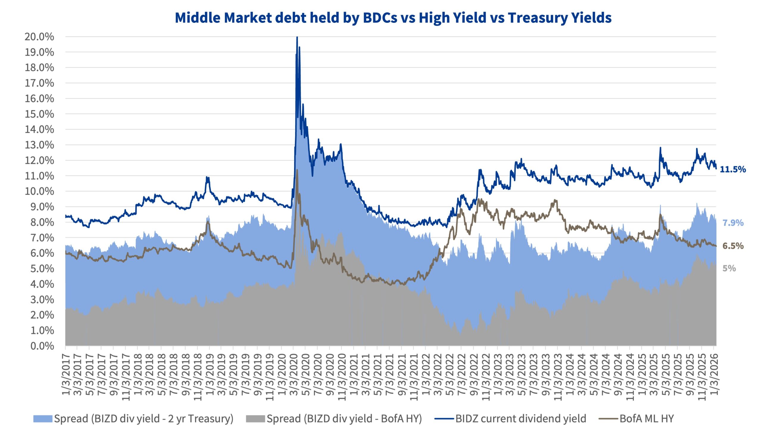 The blue line in the chart is the current dividend yield of the *VanEck BDC Income ETF (currently at 11.5% as of 15 January, versus its five-year peak of 12.8% on 8 April 2025) that tracks the overall performance of publicly traded business development companies (BDCs, are lenders to privately held middle-market businesses that tend to be below investment grade or not rated, with most lending comprising of senior secured loans). The brown line displays the BofA Merrill Lynch US High Yield (currently at 6.5% as of 15 January, down from its one-year peak of 8.5% on 7 April 2025), which tracks the performance of USD denominated below investment grade corporate debt publicly issued in the US.