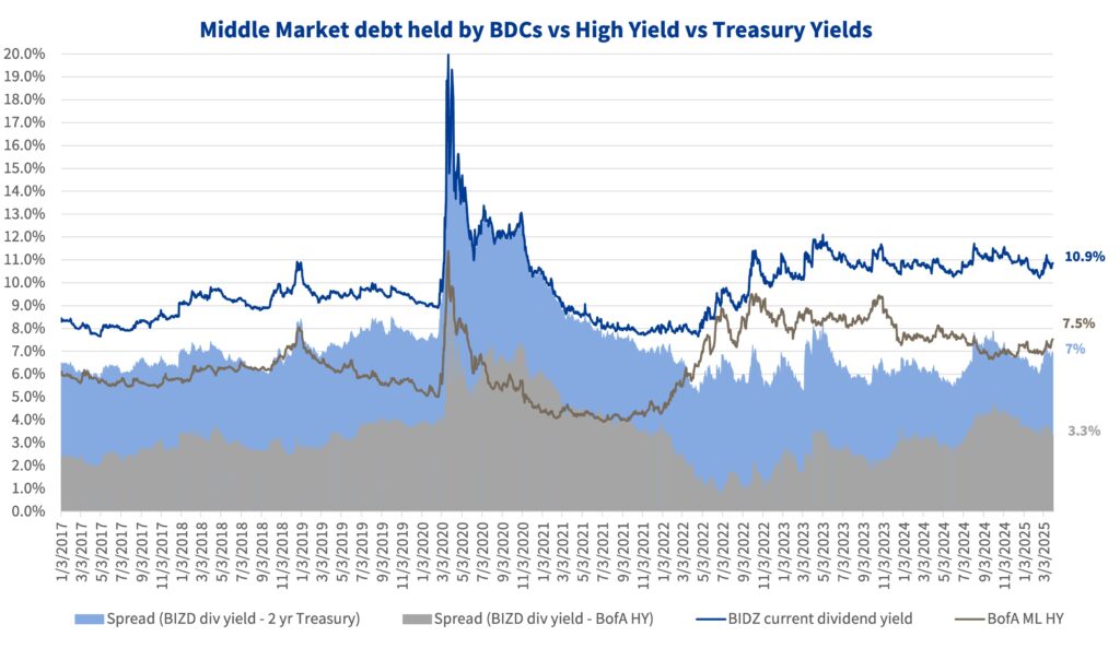 The blue line in the chart is the current dividend yield of the *VanEck BDC Income ETF (currently at 10.9% as of 31 March) that tracks the overall performance of publicly traded business development companies (BDCs, are lenders to privately held middle-market businesses that tend to be below investment grade or not rated, with most lending comprising of senior secured loans). The brown line displays the BofA Merrill Lynch US High Yield (currently at 7.5% as of 31 March), which tracks the performance of USD denominated below investment grade corporate debt publicly issued in the US.