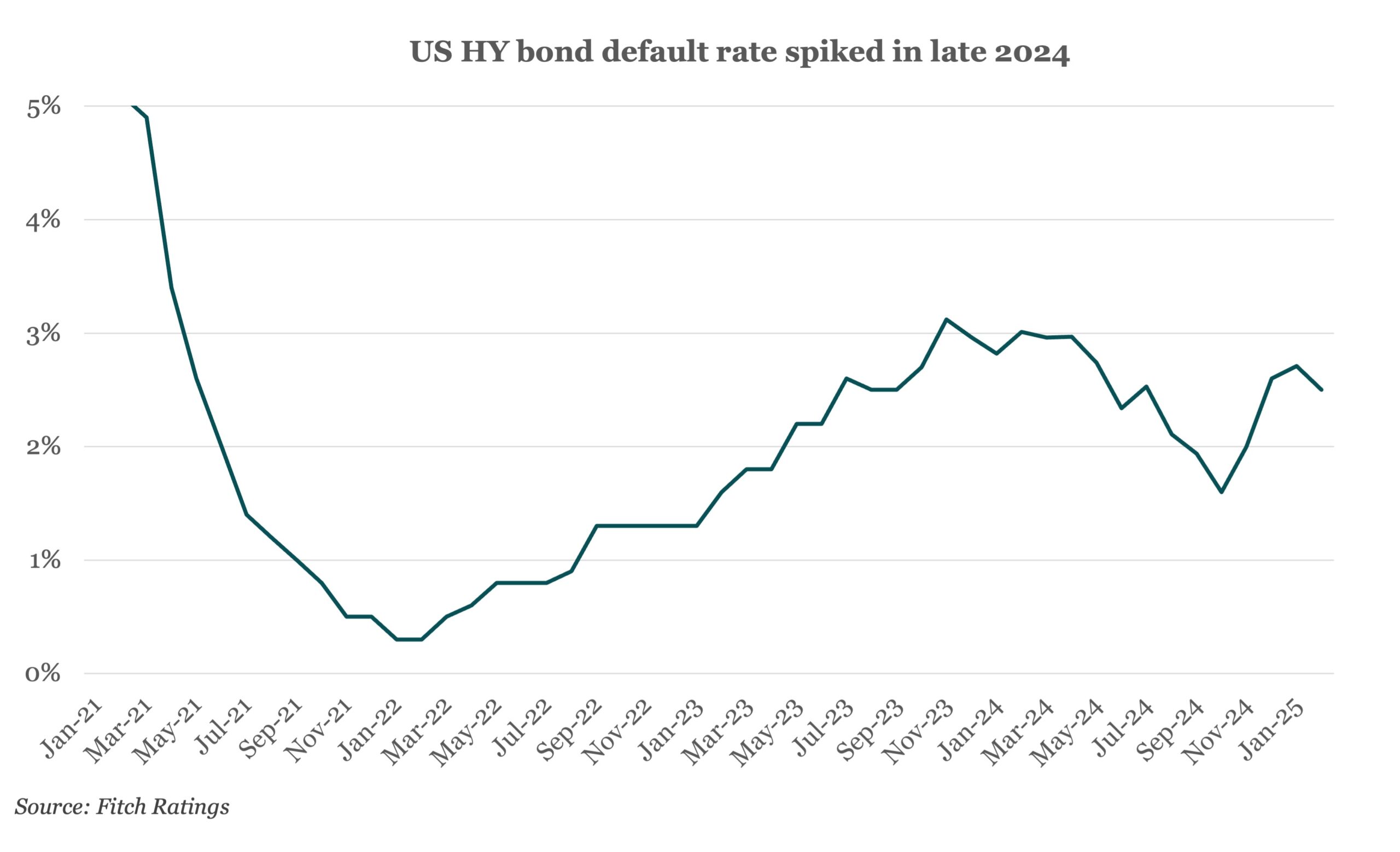 The trailing 12-month (TTM) US high-yield (HY) bond default rate has spiked in recent months following a steady decline through most of 2024. According to Fitch Ratings, the TTM HY bond default rate reached 2.5% in February, up from a low of 1.6% in October 2024.