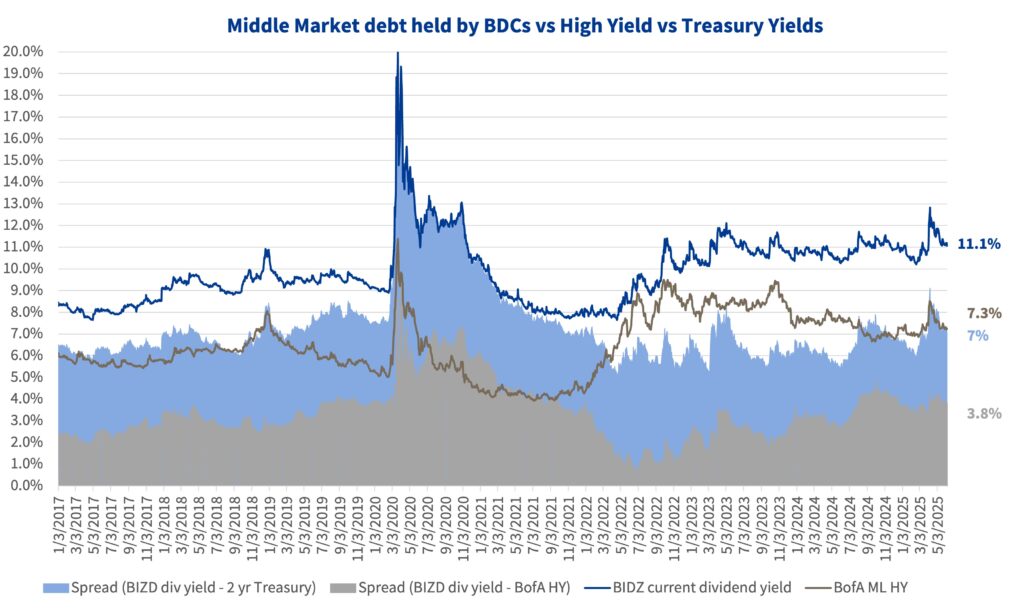 The blue line in the chart is the current dividend yield of the *VanEck BDC Income ETF (currently at 11.1% as of 6 June) that tracks the overall performance of publicly traded business development companies (BDCs, are lenders to privately held middle-market businesses that tend to be below investment grade or not rated, with most lending comprising of senior secured loans).