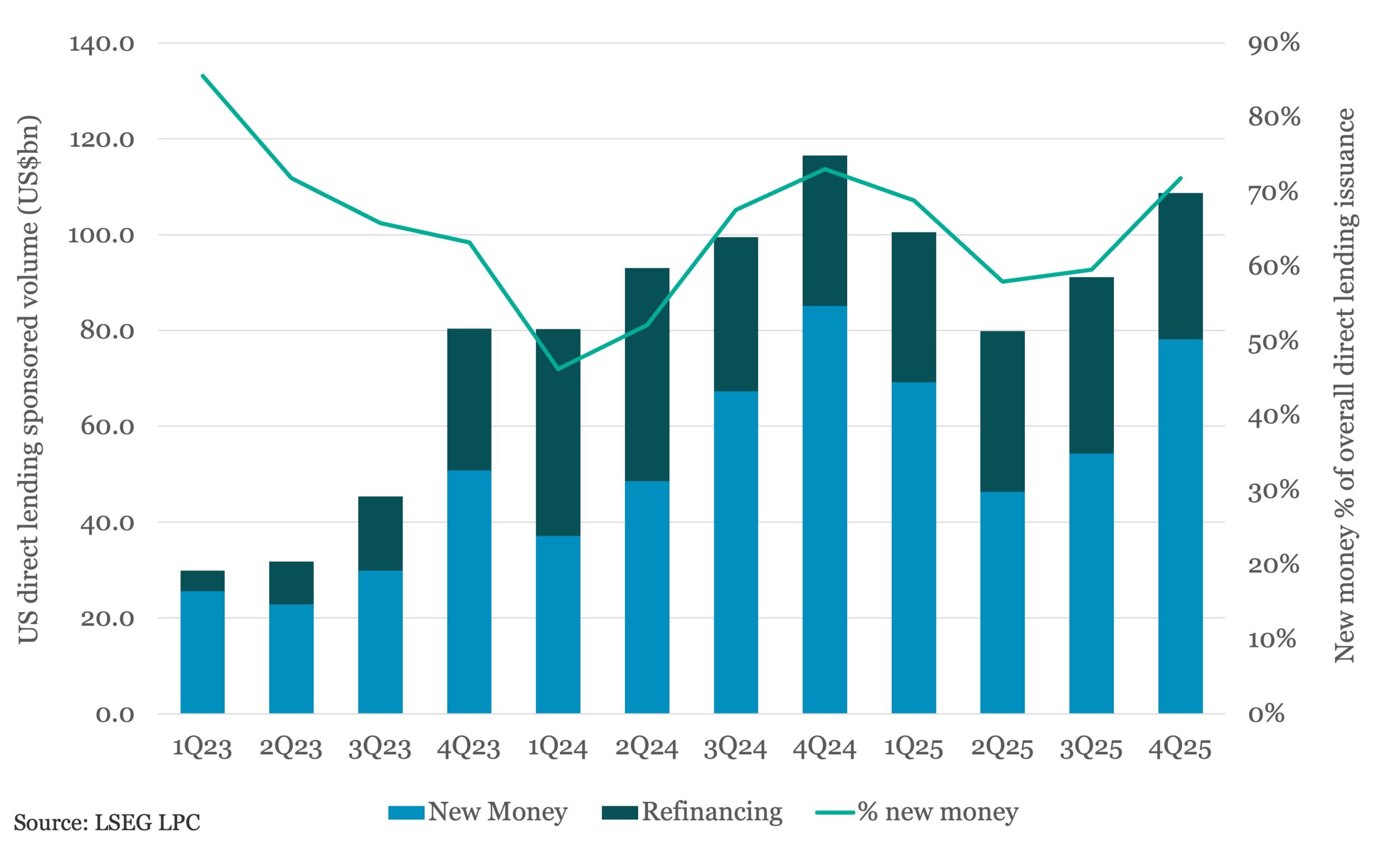 US private credit lending continued on its upward trajectory in 4Q25, driven by a jump in new money financings