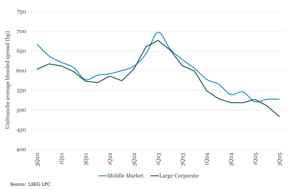 Unitranche spreads tighten for large corporate issuers in 3Q25, while middle market spreads were flat QoQ