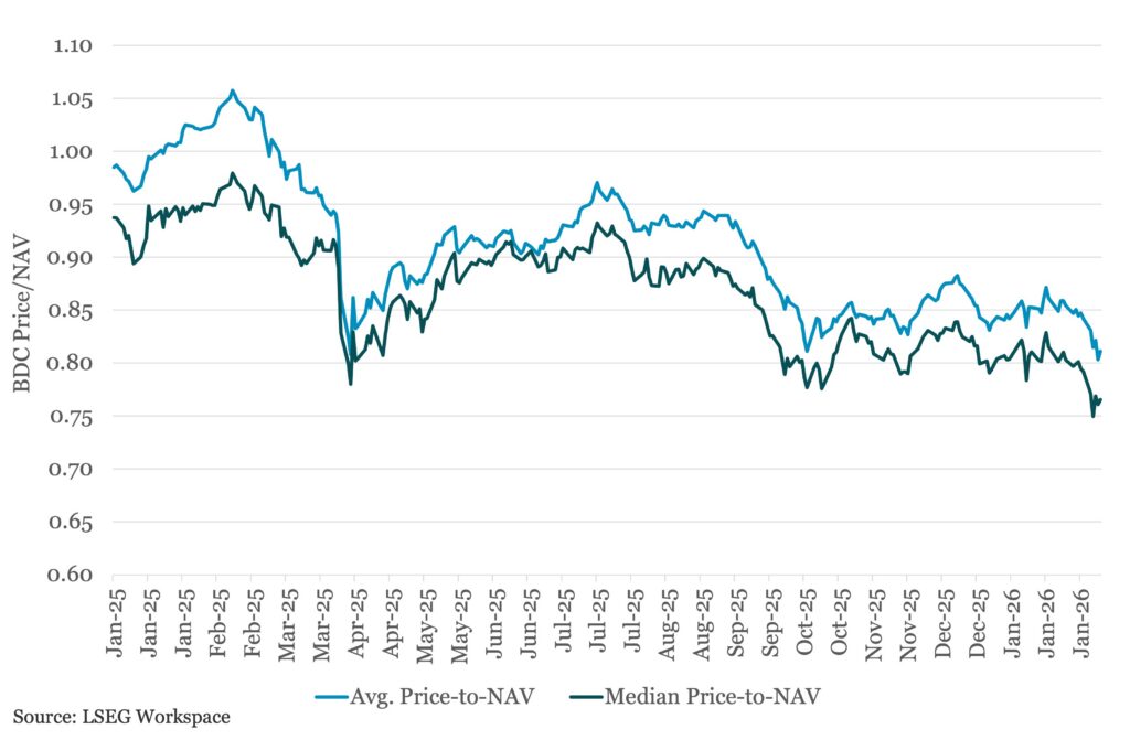 BDC valuations have moved lower recently amid some concerns around credit quality, specifically in the software sector, in which many BDCs have sizeable stakes.