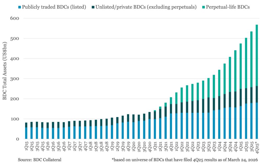 BDC AUM climbed to a new high of US$568bn in 4Q25