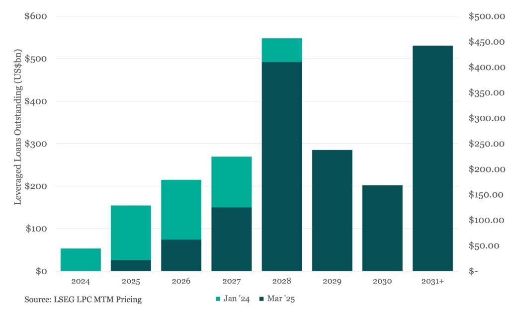 Evolution of leveraged loans by vintage shows notable reductions in near-term maturity walls