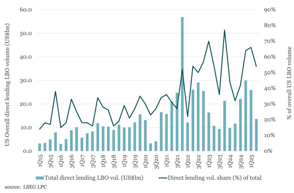 2Q25 Total US direct lending LBO volume down over 47% quarter over quarter
