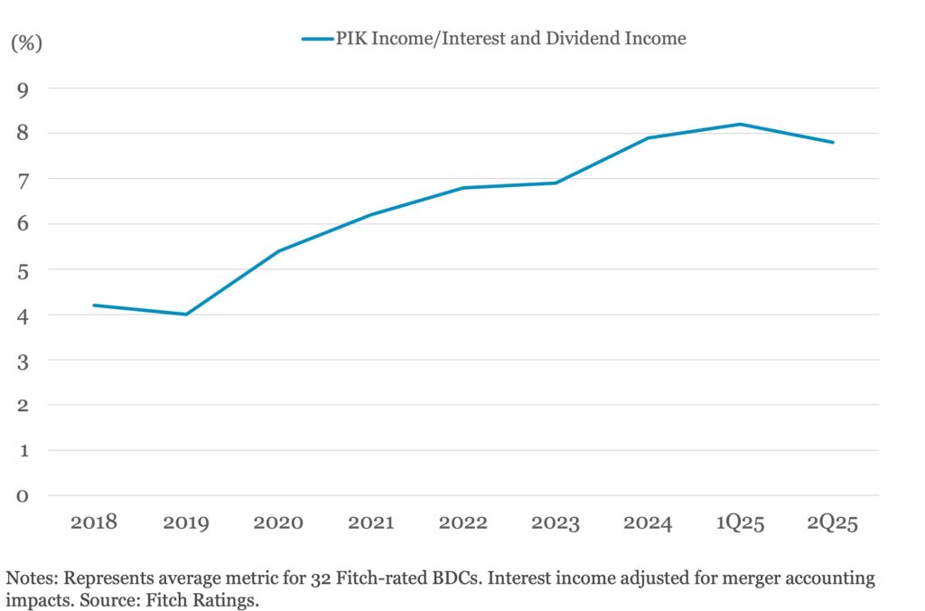 Payment-in-kind (PIK) income for Fitch-rated business development companies (BDCs) declined modestly in 2Q25 but remains above pre-2024 levels. This reflects persistent challenges in portfolio credit quality and the impact of structured PIK arrangements amid elevated interest rates. The latest quarterly earnings data reveal diverging PIK trends across the sector, with some BDCs reporting significant reductions while others saw increases, partially linked to portfolio amendment activity and asset quality pressures.