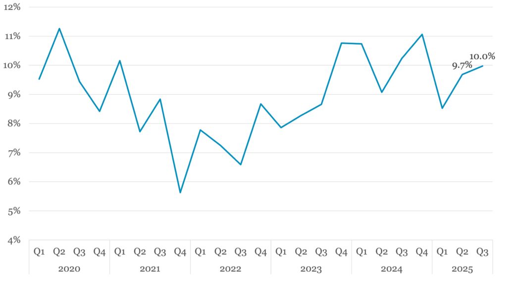 Carveout/divestiture count as a share of all PE middle-market deals by quarter