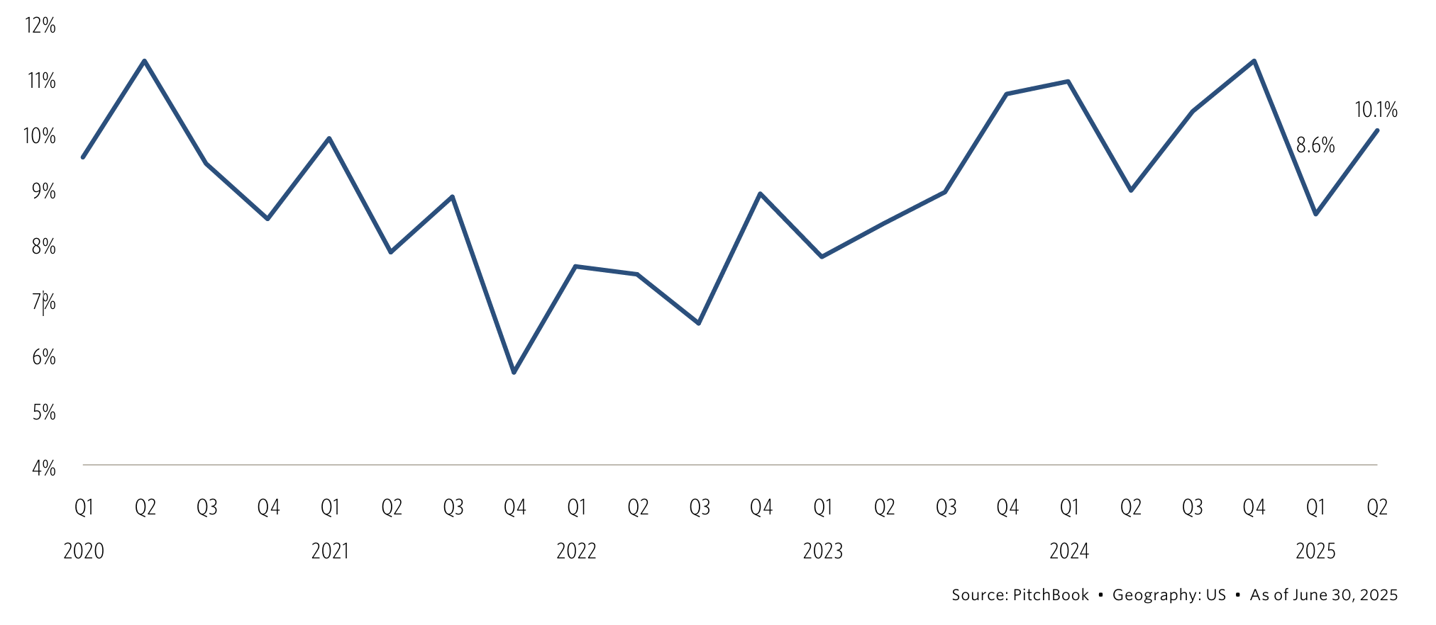 Carveouts remained a consistent feature of middle-market deal activity in Q2 2025. They accounted for 11.1% of deal value during the quarter, up from 10.9% in Q1 and broadly in line with the five-year annual average of 11.4%.