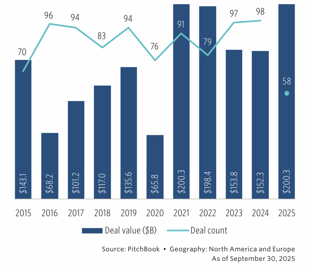 Middle-market take-private activity dwindled in Q3, with PE buyers underwriting just four announced or completed deals under $1 billion across North America and Europe.
