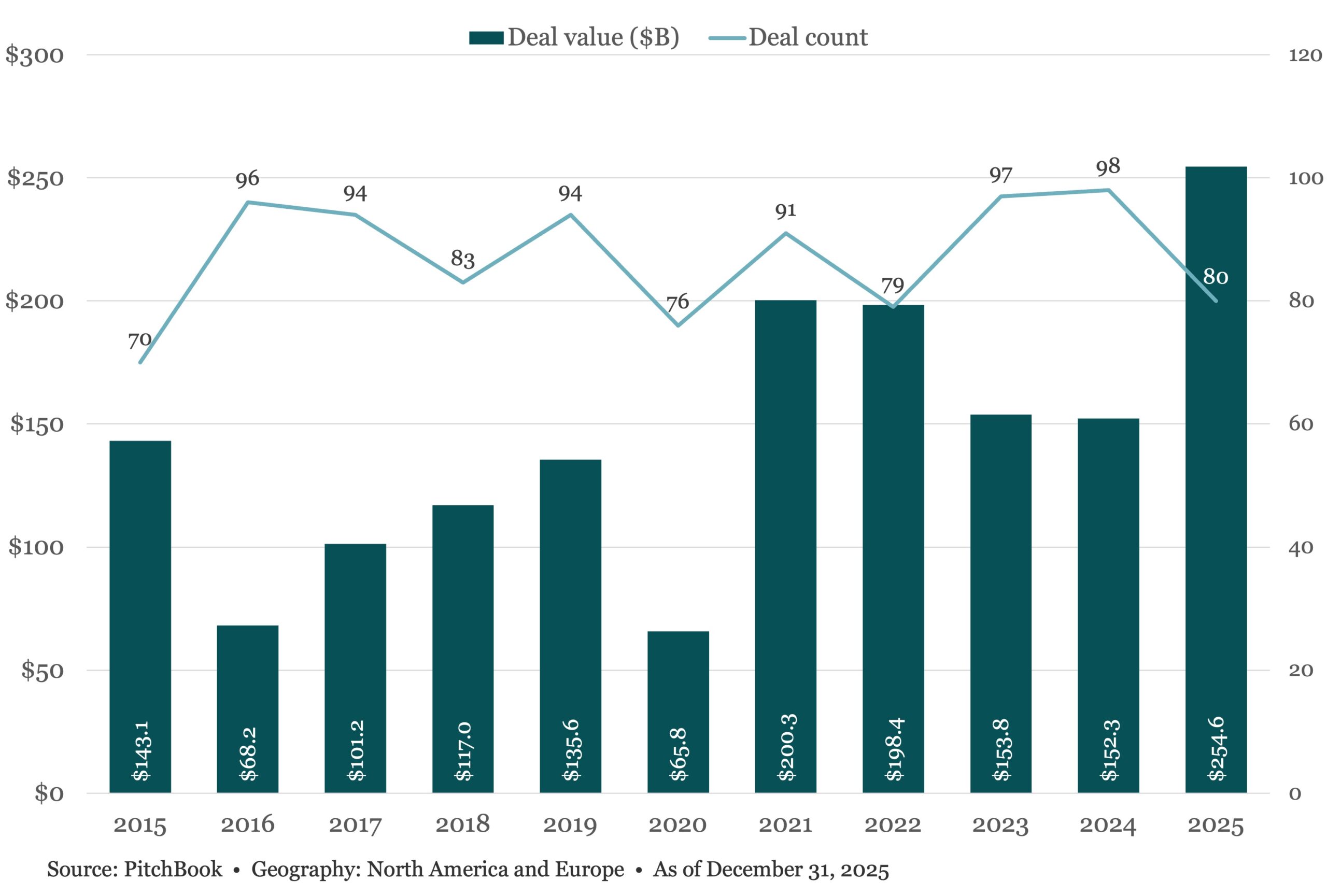 Take-private deal value was buoyed by a handful of gargantuan deals, even as the number of transactions declined YoY.