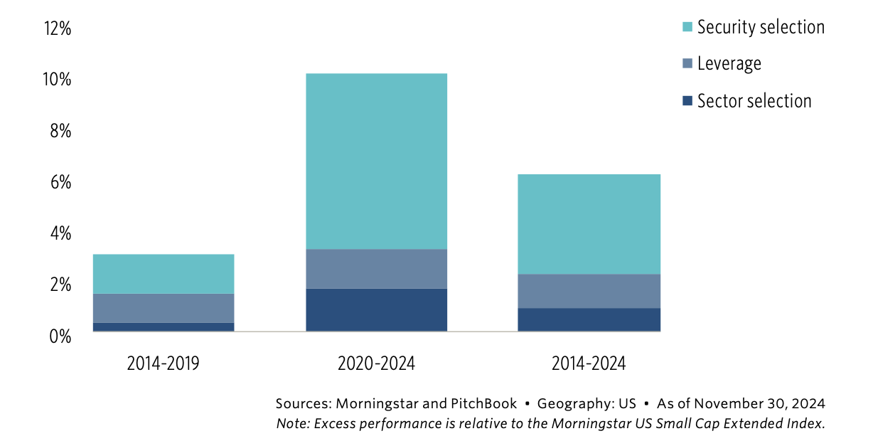 Morningstar PitchBook Buyout Replication Index excess performance attribution (annualized)