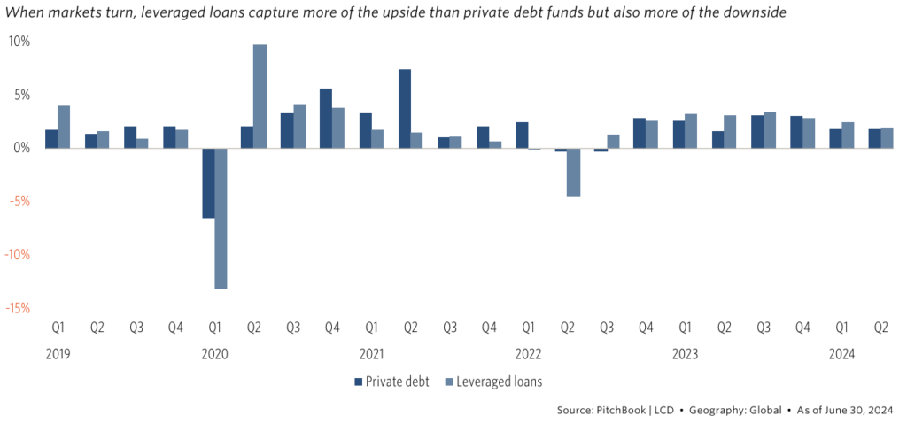 Private debt fund versus leveraged loan returns by quarter