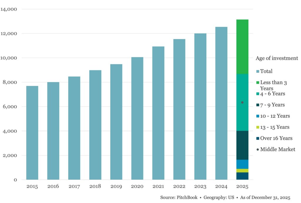 As of Q4 2025, the US PE inventory has grown to over 13,143 companies.