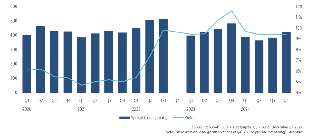 New-issue spread and yield to maturity of loans backing LBOs by quarter
