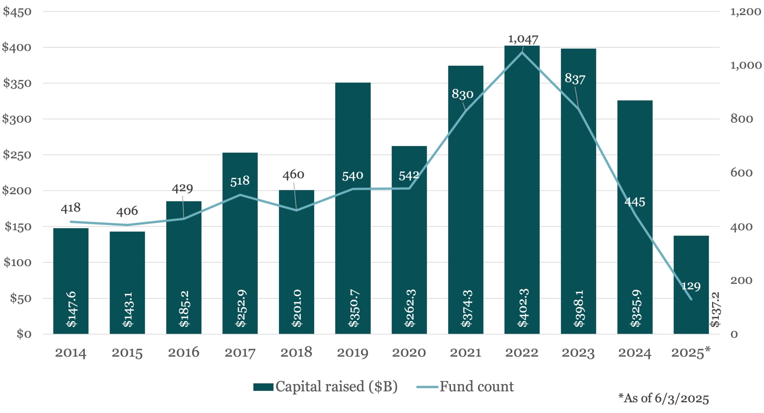 PE fundraising has landed at a lower level than in 2024, which was already a worse year for fundraising than the three years prior, where the industry saw record-setting fundraising.