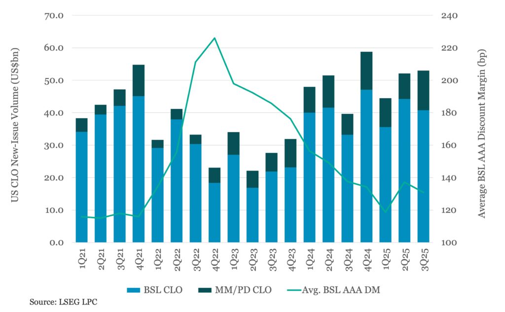 New-issue US CLO volume amounted to US$53bn in 3Q25 via 106 deals, up 2% from 2Q25’s US$52.1bn and 34% from 3Q24’s US$39.6bn, marking the highest quarter since 4Q24.